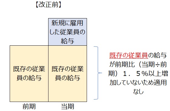 改正前の制度は既存の従業員の給与が増加している場合に適用がありましたが、改正後は既存の従業員の給与は据え置いているものの、新規に従業員を雇用した場合に給与が増加して要件を満たせば所得拡大促進税制の適用が受けられるようになりました。