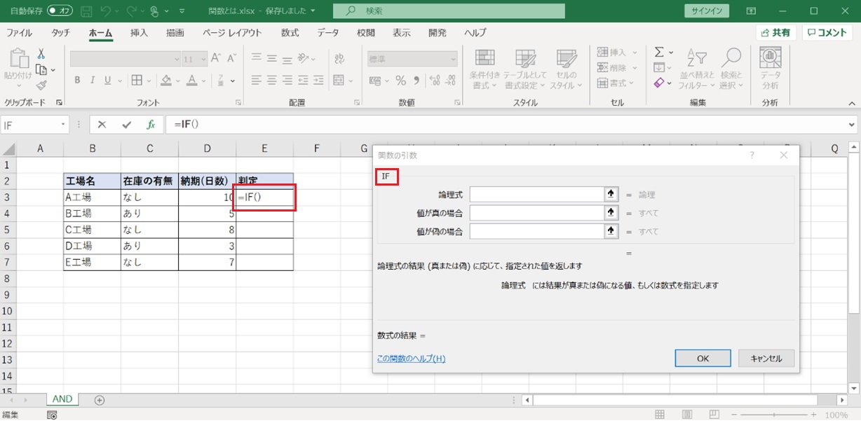 その後OKボタンを押すと下記のようにIF関数の論理式にAND関数の内容が反映されています。