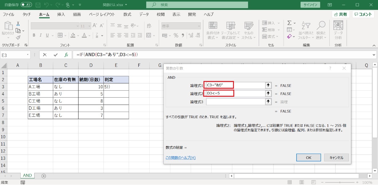 そして、論理式1には在庫の有無を判断する【C3="あり"】を入力します。次に論理式2には納期が5日以内かを判断する【D3<=5】を入力します。