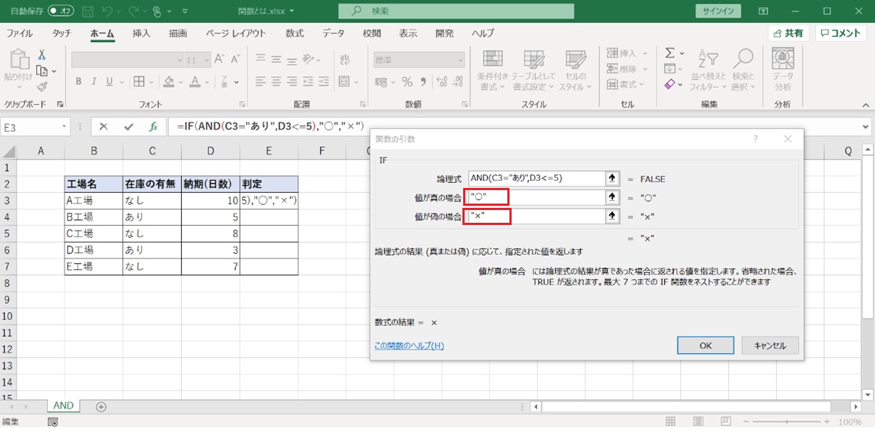 あとは、通常のIF関数の使い方と同じく条件を満たしていた場合には〇をそれ以外には×を入力します。