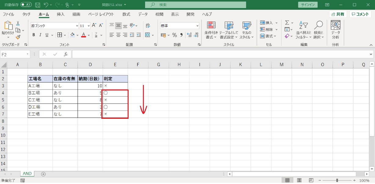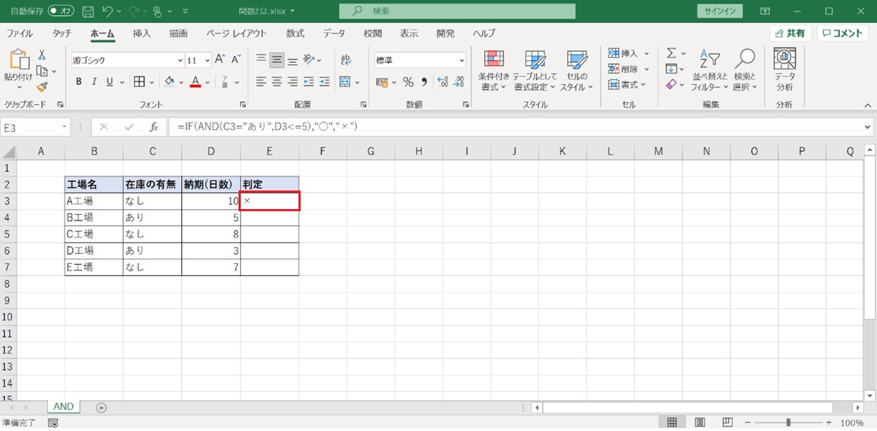 AND関数はIF関数と合わせて使用することが多い関数です。今回は、C列の在庫の有無がありで、D列の納期が5日以内の場合に〇をそれ以外は×をE列に表示させます。