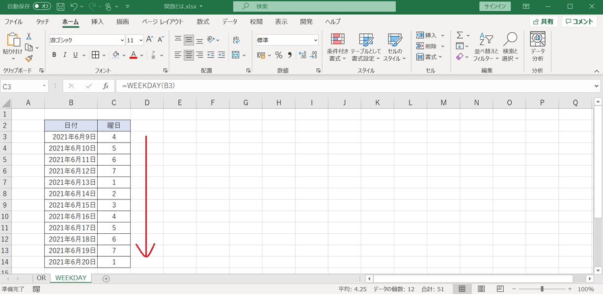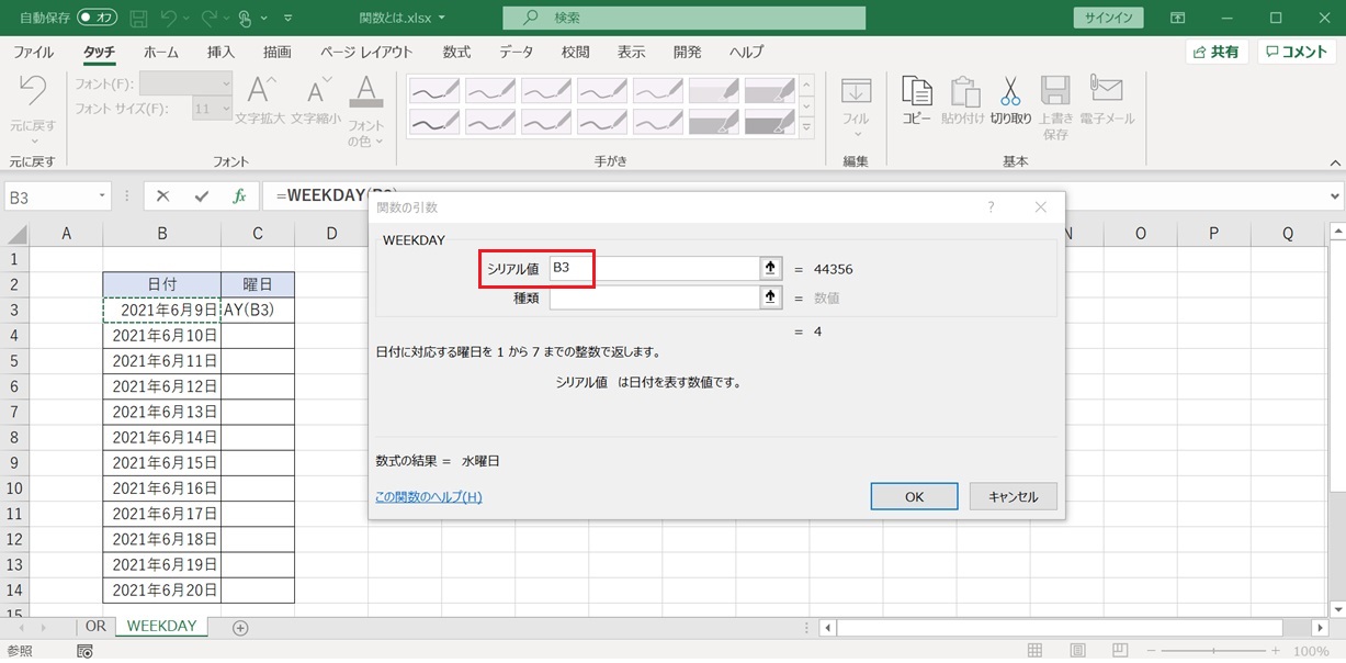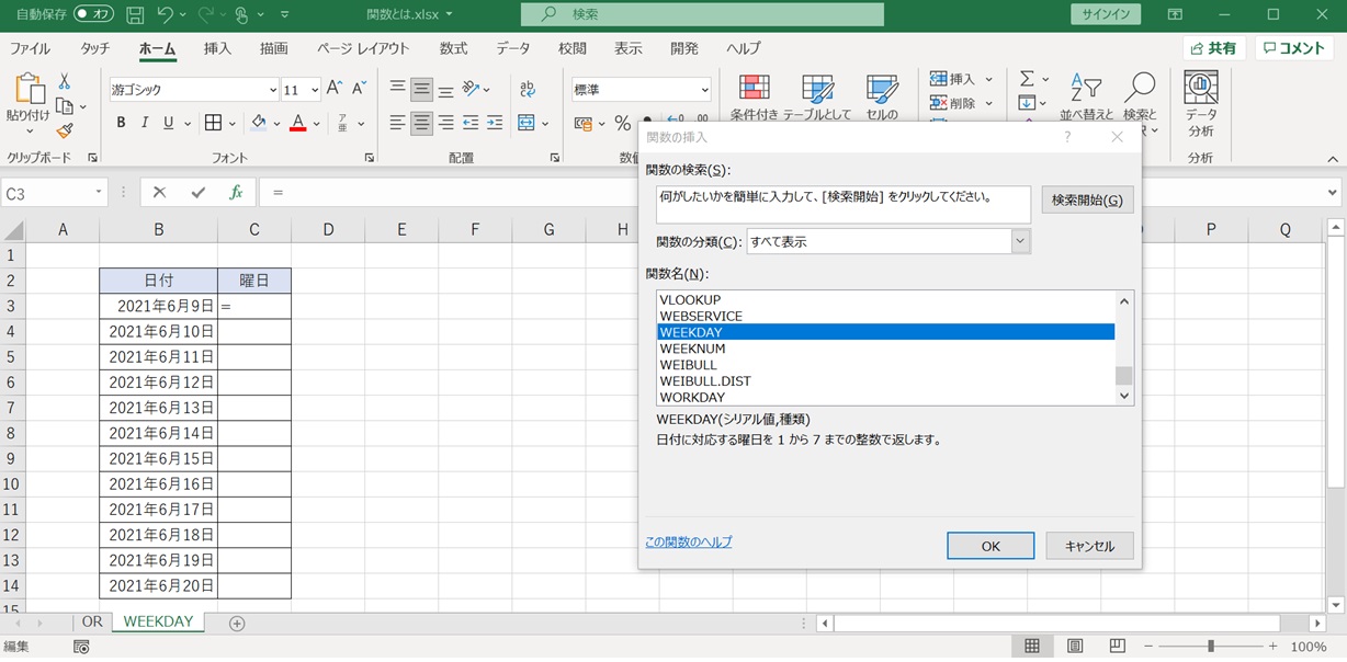 まずは、C3のセルを選択してWEEKDAY関数を表示します。