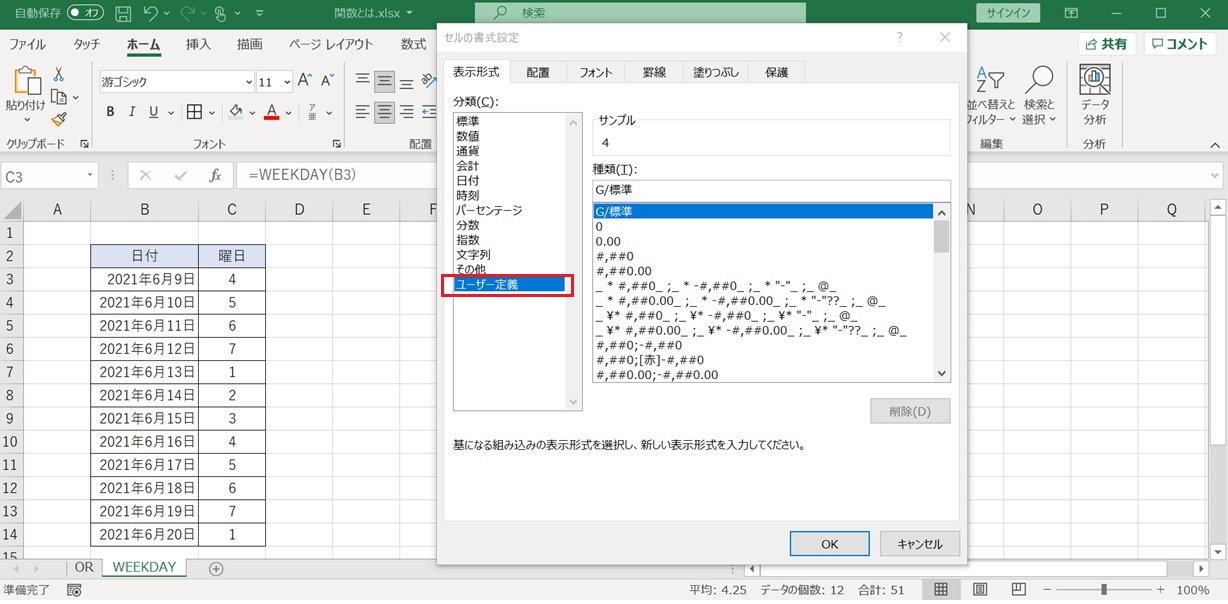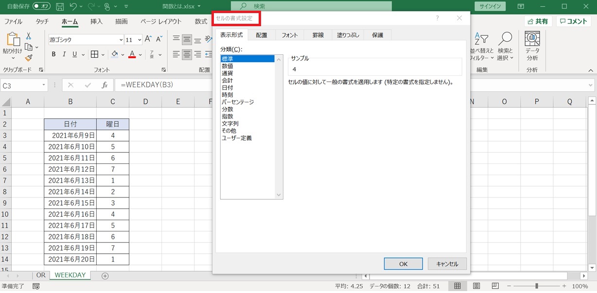 そうすると、C3のセルに数字の4が表示されます。...曜日が表示されない??