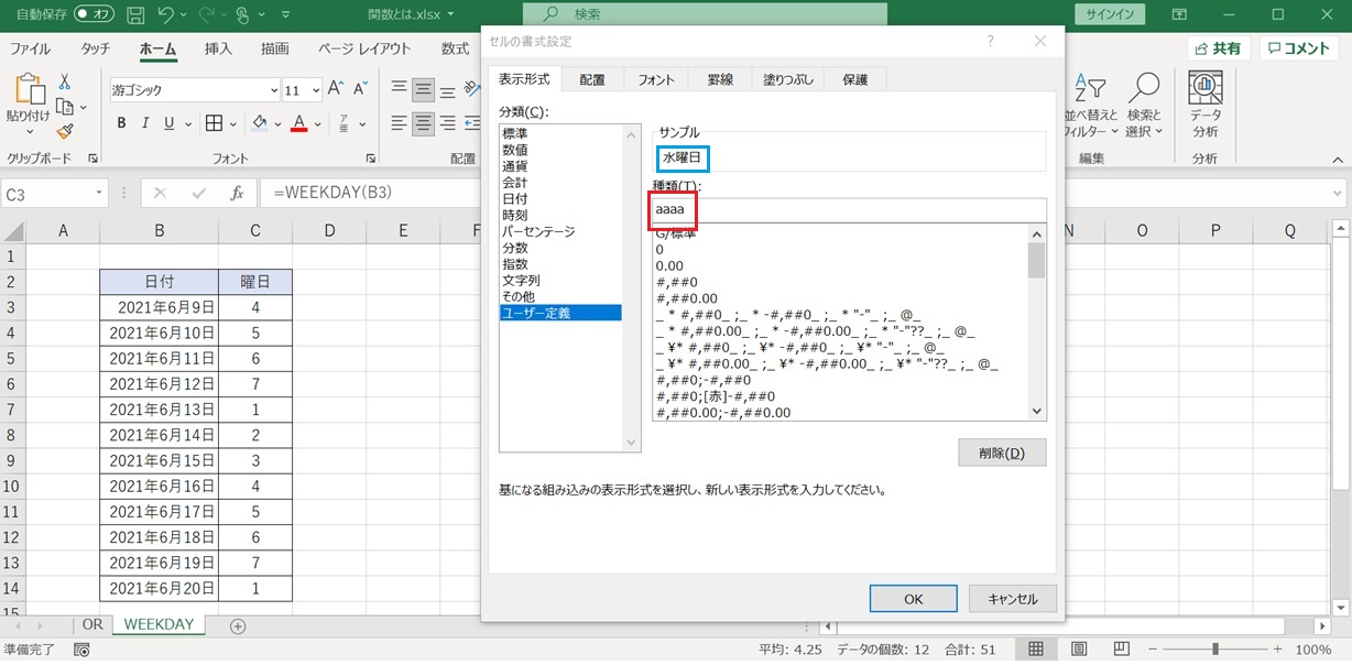 さらに、【aaa】にaを一つ追加すると、サンプルに【水曜日】と表示されます。