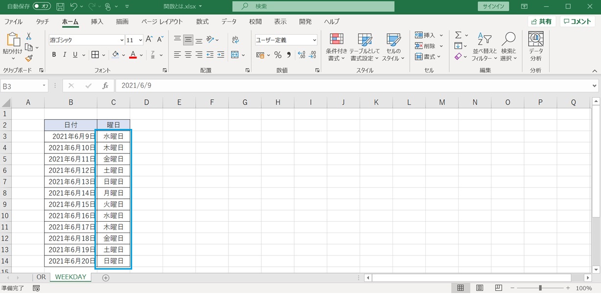今回は、B列の日付に対応する曜日をWEEKDAY関数を使ってC列に表示させます。