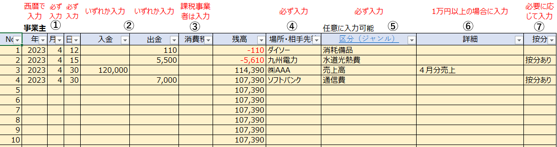 例えば、5月3日のレシートを入力した後に、4月22日のレシートの入力漏れに気づいた場合には、5月3日の下の行から入力していただいて問題ないと言うことです。(当事務所が正式な会計書類を作成する際に正しい日付順に並び変えます。)