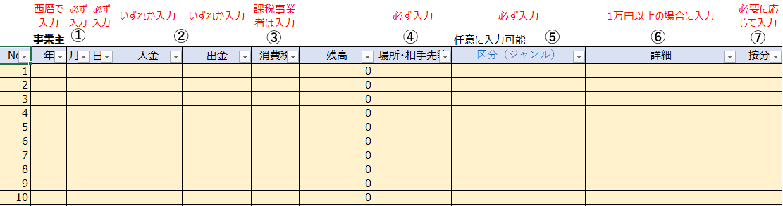 当事務所の入力用シートの事業主勘定部分に関する説明です。まずは、下記の図をご確認ください。