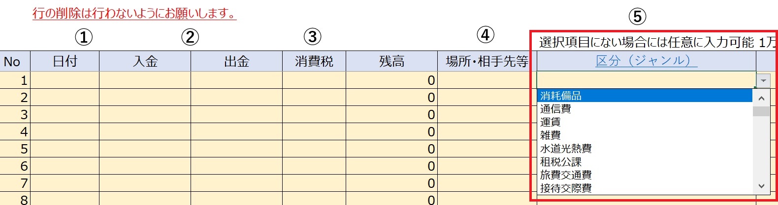 お支払額又はご入金額が1万円を超える場合にご入力お願いします。例えば、PC関連備品を購入した場合に、1万円未満であれば、⑤区分(ジャンル)のみ選択いただければ結構ですが、1万円以上の場合には具体的にPC関連備品とは何かをご入力お願いしております。