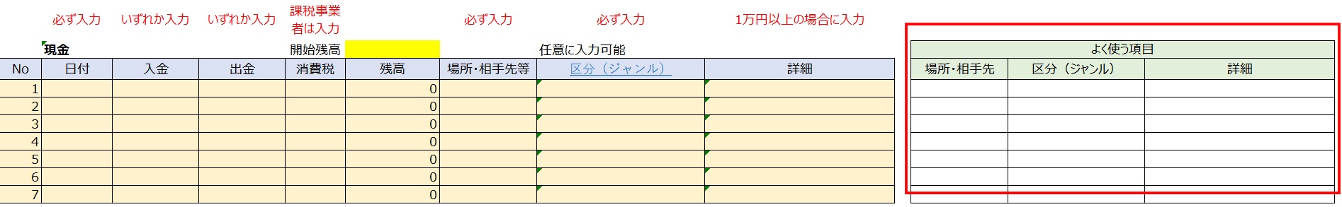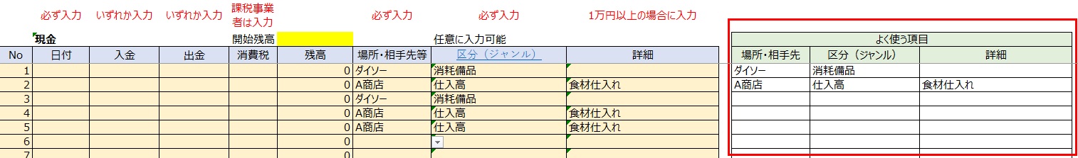 以上が入力補助機能の説明となります、定期的にまとめて帳簿を記帳していると、「この取引は何の区分を選択していたっけ?」と忘れてしまうことがありますので、事前によく使う項目を登録しておけば場所を選択するだけで必要事項の入力が完了します。
