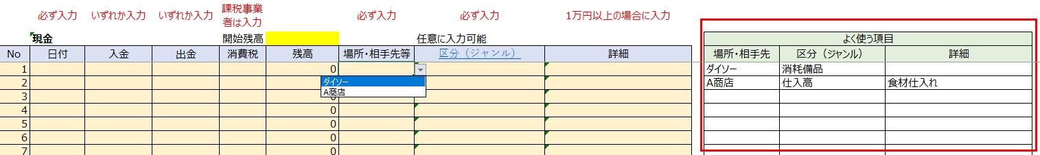 よく使う場所・相手先との取引が1万円を超えることが多い場合にその内容を登録します。