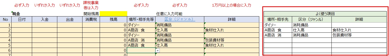 例えば、上記の図であれば、A商店との取引のうち食材関係に関しては(A商店 食)と入力し、消耗品関係は(A商店 消)と入力しています。