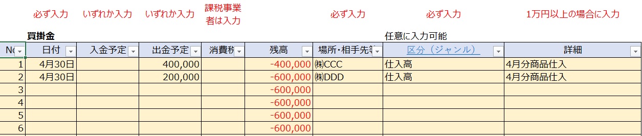 実際に仕入をした日付とは異なりますが、4月末日締め分(商品の引渡し、サービスの提供、工事の施工等が完了した月)として、30日の仕入として構いません。また、㈱DDDからの仕入は4月中に支払われているため、厳密には掛け取引に該当しませんが、買掛金シートに仕入のすべてを入力したほうが分かりやすいです。