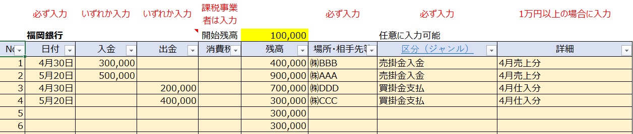 ※【場所・相手先等】は売掛金シートと同じ名前で入力する必要があります。