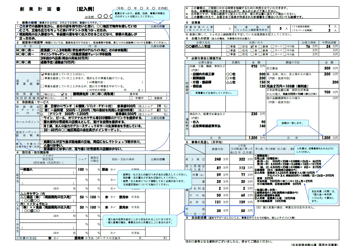 創業計画書の記載方法は日本政策金融公庫のHPに豊富な記載例がありますのでこちらでご確認いただけます。